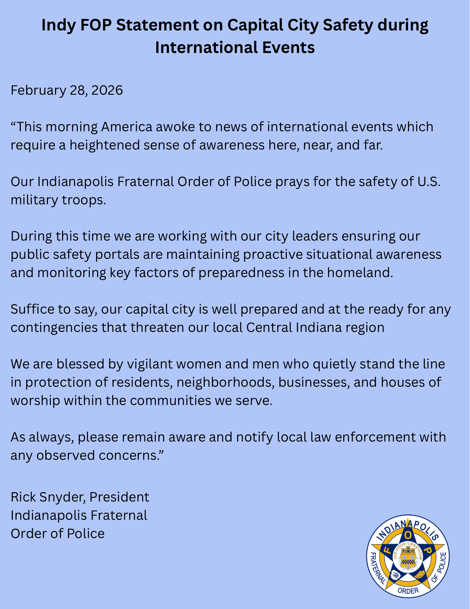 ©2020 Indianapolis Fraternal Order of Police, Lodge #86 All Rights Reserved. This video, written message, image, or other material is protected under the laws of the United States and other countries. Unauthorized duplication, distribution, or exhibition without expressed written permission may result in civil liability and criminal prosecution.